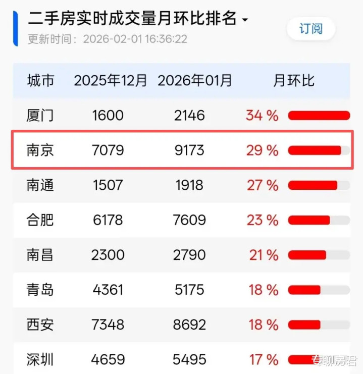 數據上,南京二手房在2026年1月份的成交量為9173套,環比增長為世界城市第二,增幅遠高于四大一線城市。二手房成交量通達3個月保執在7000套以上,“量在價先”,執續的爆量,終于在1月份出現價錢回升了。