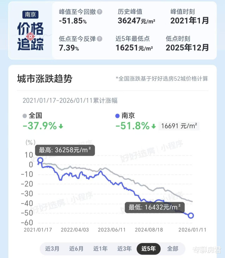 南京自己屬于新一線城市、強二線中樞城市,憑據好好選房數據顯現,從2021年樓市高點調度以來,世界跌幅為37.9%,而南京跌幅則達到了51.8%,后者遠超世界平均跌幅。咱們常說,漲多了就會調度,跌多了就會補漲,過度深跌顯著不行執續,例必會總結到自己價值。