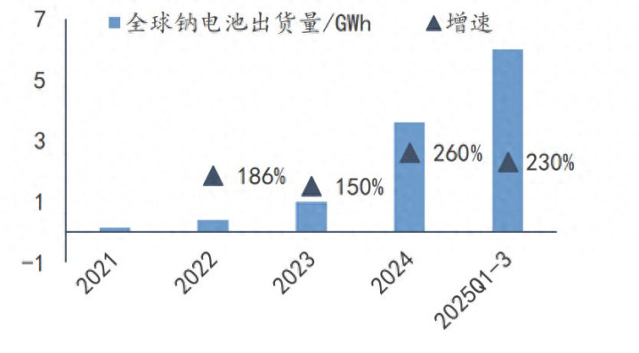 2021~2025Q1-3 全球鈉電池出貨量(GWh)